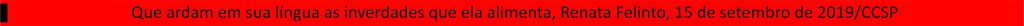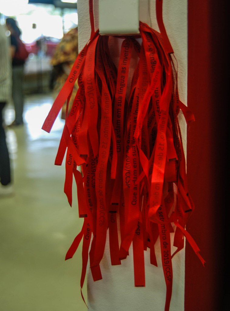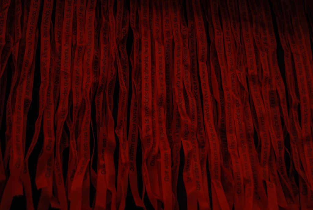 Que ardam em sua língua as inverdades que ela alimenta, 2019, impressão em fita de cetim em tons de vermelho, 42,5 x 1,0 cm .