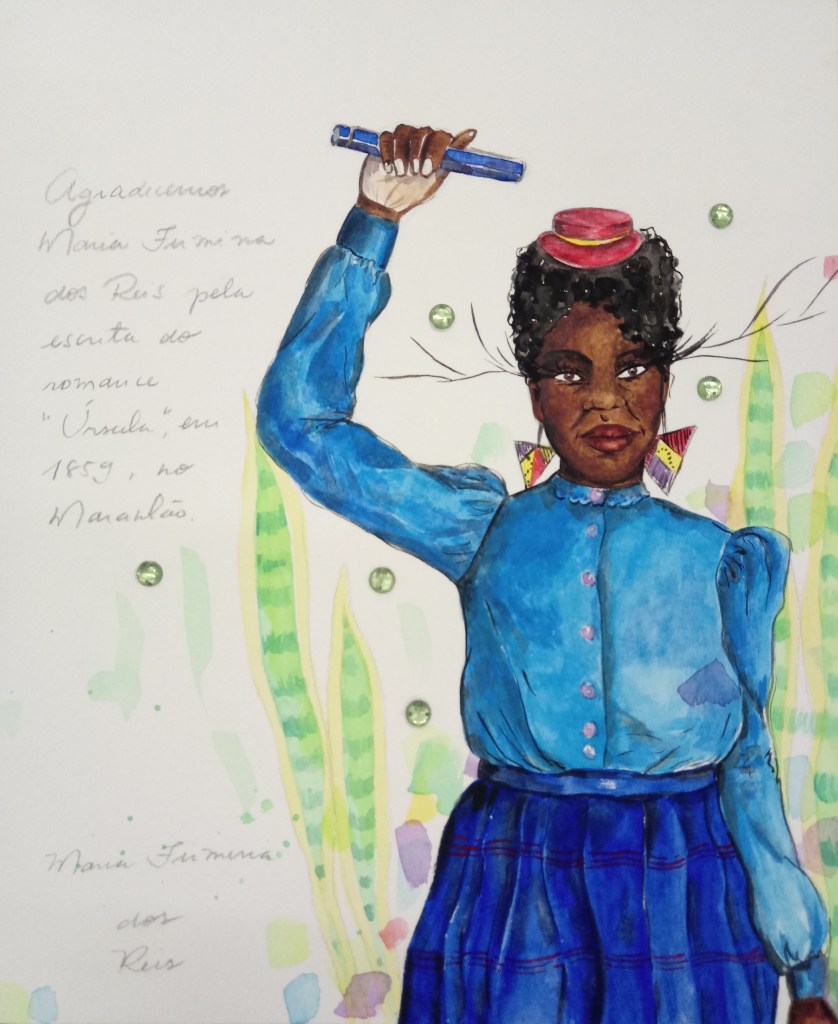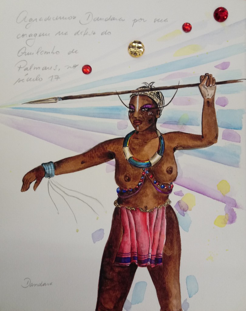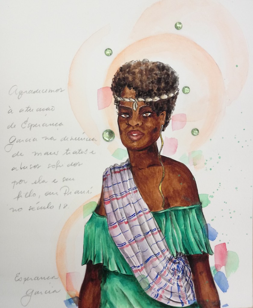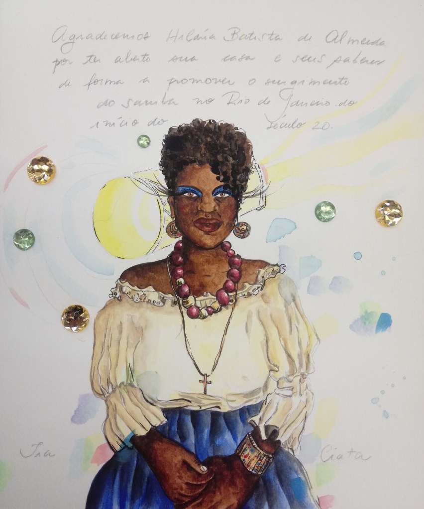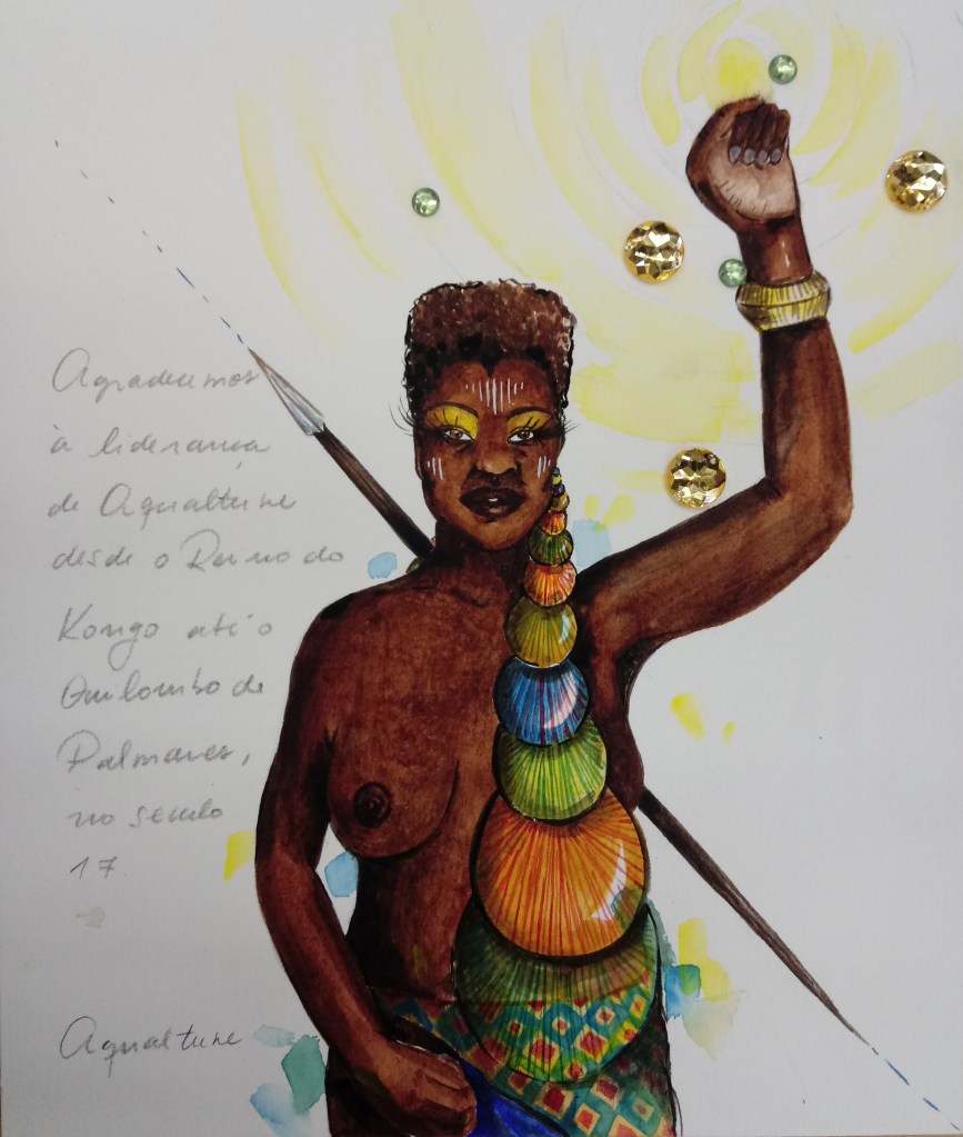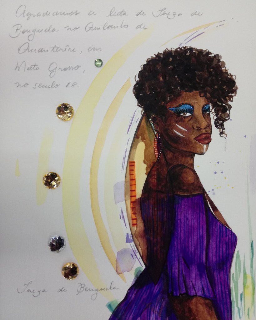 Pinturas em aquarela que recriam os rostos sistematicamente apagados dessas mulheres negras importantes para a história do Brasil. Elas significam as existências e resistências das demais mulheres negras que continuam nos processos de revolução e emancipação, seja social, econômica, afetiva, ou de restituição das suas humanidades. Transformadas em ex-votos, essas pinturas compõem um congá/instalação, um lugar sagrado, de agradecimentos e reconhecimento dos feitos e contribuições conquistadas por essas mulheres.