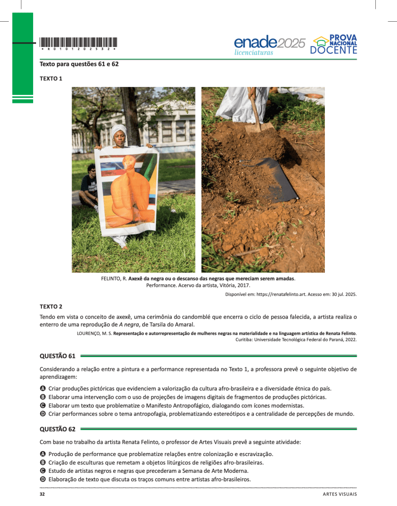 I thank the professionals of the Anísio Teixeira National Institute for Educational Studies and Research (INEP) for their consideration and for the complexity of the question, which addressed a work that reflects on the history of visual arts, one of the icons of Brazilian modernism, and the hyperexposure of Black bodies—especially women’s bodies—in the iconography of that movement. I express my gratitude to those who reached out and wish success to all who took part in the exam. The work of Visual Arts educators is essential to building a critical and sensitive education.